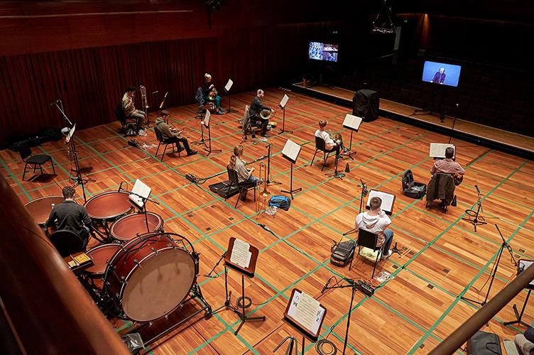 The socially distanced orchestra that has been set up at the School is a bit of a marvel of logistics that has been enabled by some very clever technology. 54 socially distanced strings sit in one room, with brass and percussion in another room, a 13–piece woodwind section in another (sitting three metres apart rather than the usual two due to the particulates that the players exhale), and so on.